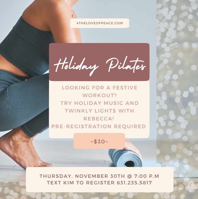 Well, I think it’s ok to admit that the holidays are not always an easy time. No secrets there. BUT, something I find always keeps me on my toes is making time for a great workout. Lucky for me, I’ve teamed up with an incredible pilates instructor, Rebecca. Join us at the end of November for a FESTIVE HOLIDAY PILATES session. Twinkly lights? Check. Holiday music? Check. Endorphins for all? CHECK!!! Consider registering today!